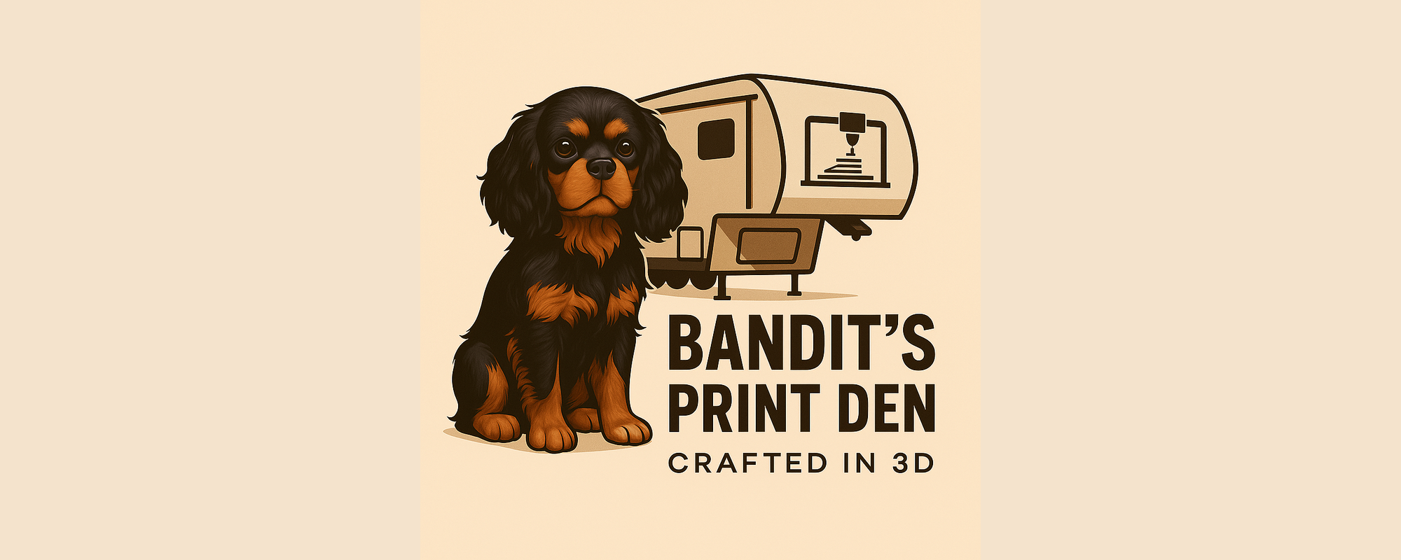 Welcome to Bandit’s Print Den, a mobile 3D-printing studio built inside a fully outfitted fifth-wheel workshop — proudly overseen by Bandit, the black-and-tan Cavalier King Charles Spaniel and resident quality-control expert.